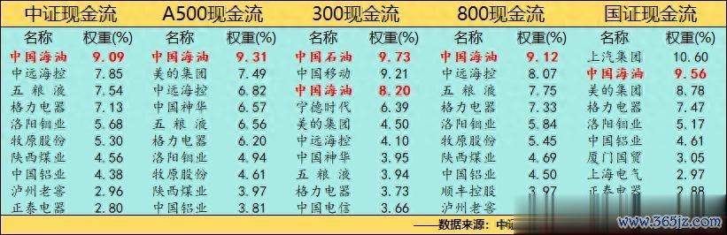 上图是主流现金流指数的前十大权重样本权重数据,可以看到海油在5只指数中都位于前三大权重,其中更是中证现金流、A500现金流和800现金流这三只指数的头号权重,中石油则是300现金流的头号权重股,至于中石化,他在哪里?我看不到他......